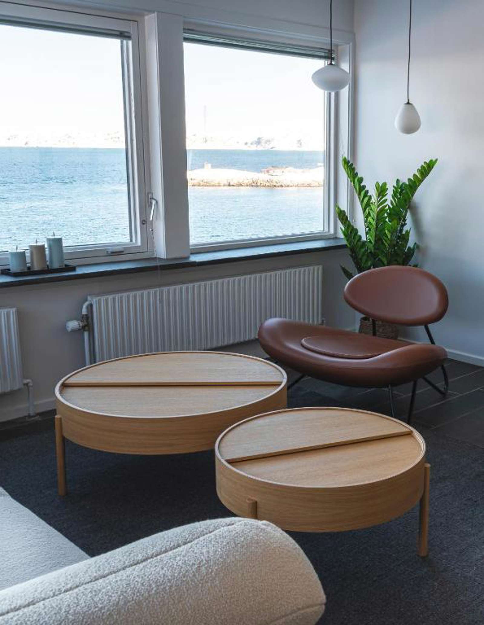 Stor og rummelig spisestue med højt til loftet der går over i en stue med store panoramavinduer, der giver den flottestes udsigt & solnedgang over fjorden og ikke mindst kolonihavnen.